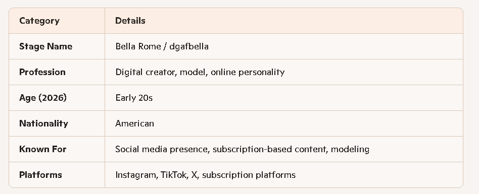Bella Rome — widely known online as dgafbella — is a digital creator, model, and social media personality who rose to prominence through her bold online persona and subscription‑based content. Over the past few years, she has built a strong presence across platforms like Instagram, TikTok, and X, where her confident style and unfiltered personality have attracted a rapidly growing audience.