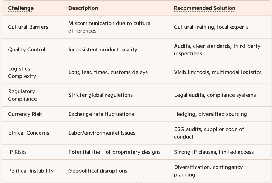 Solution: Invest in cultural intelligence programs and hire local sourcing specialists. Regular in‑person visits and transparent communication channels help build trust and reduce misalignment. Tools like cross‑cultural training and local supplier onboarding can accelerate relationship building.