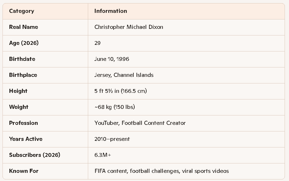 ChrisMD, born Christopher Michael Dixon, is one of the UK’s most influential football‑entertainment YouTubers. Rising from FIFA gameplay videos in 2010 to becoming a leading personality in real‑world football challenges, charity matches, and high‑production sports content, Chris has built a reputation for precision, humor, and authenticity. As of 2026, he remains the most‑subscribed creator from Jersey, with a channel that blends football skill tests, professional‑player collaborations, and viral challenge formats. His content has evolved significantly, shifting from gaming to hybrid sports entertainment, attracting millions of viewers worldwide.