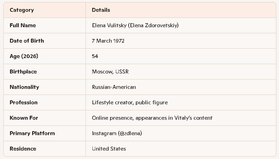 Elena Vulitsky, also known by her legal surname Elena Zdorovetskiy, has become a recognizable figure in the lifestyle and digital‑media space. Although many first discovered her through her son, YouTube creator Vitaly Zdorovetskiy, Elena has steadily built her own identity online. Her refined aesthetic, wellness‑focused lifestyle, and charismatic presence have made her a relatable personality for audiences interested in elegance, maturity, and personal growth. As of 2026, she continues to share glimpses of her life with a loyal following, particularly on Instagram under the handle @zdlena.