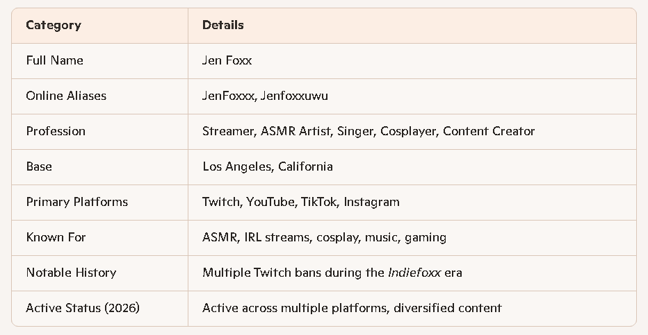 Jen Foxx, known online as JenFoxxx and Jenfoxxuwu, remains one of the most recognizable personalities in the streaming and ASMR space. Based in Los Angeles, she has built a multi‑platform career that spans Twitch, YouTube, TikTok, music, cosplay, and IRL content. Her evolution from the early Indiefoxx era to her current brand reflects a creator who has adapted to platform shifts, audience expectations, and the increasingly competitive creator economy.