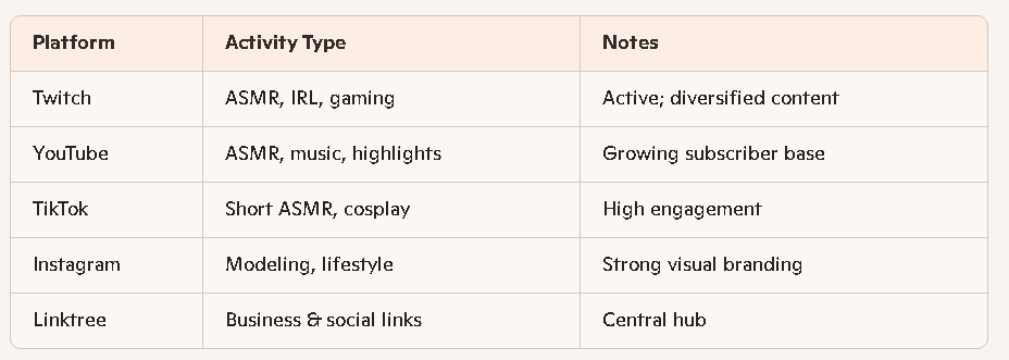 • YouTube: She posts ASMR, IRL highlights, music, and collaborations. Her channel describes her as a model, musician, and content creator with a mission to create joyful, escapist content.