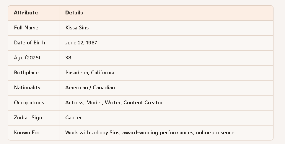 As of March 2026, Kissa Sins is 38 years old, born on June 22, 1987. Her age is consistently documented across updated profiles and remains one of the most searched details about her due to her long-standing presence in the industry.