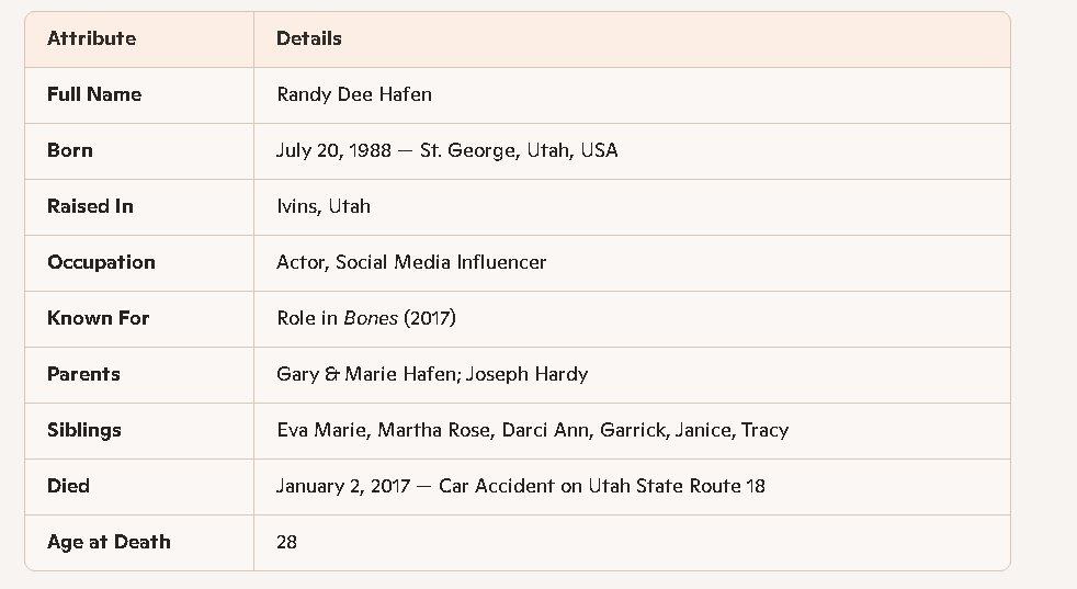 For those discovering him today, Randy Dee Hafen was an American actor and social media personality best known for his appearance on Bones. Beyond acting, he was a builder, a traveler, and someone who thrived on adventure. His online followers admired him for his authenticity — he shared real moments, real struggles, and real passions.