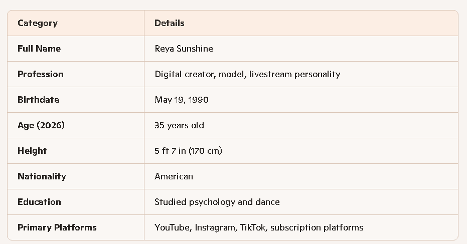 Reya Sunshineās journey reflects the evolution of modern digital creatorsāindependent, adaptable, and deeply connected to their audiences. From her early days studying psychology and dance to becoming a recognizable figure across multiple online platforms, she has built a career rooted in consistency, creativity, and direct fan engagement. As of 2026, Reya continues to expand her brand through new ventures, collaborations, and live appearances, demonstrating how creators can thrive longāterm in an everāchanging digital landscape. Her story serves as a valuable example for aspiring influencers and entrepreneurs who want to build sustainable careers in the creator economy.