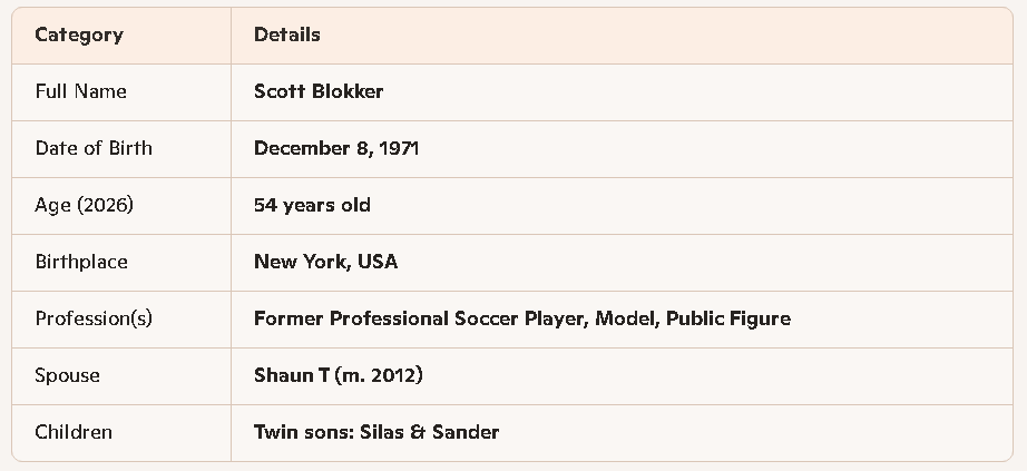 Scott Blokker has built a multifaceted public identity — from professional soccer player to model, to becoming widely recognized as the husband of fitness icon Shaun T. As of 2026, he remains an influential figure in the wellness and family‑lifestyle space, known for his authenticity, LGBTQ+ advocacy, and hands‑on parenting of twins Silas and Sander. His journey spans sports, entertainment, and personal transformation, making him a compelling figure beyond his association with Shaun T.