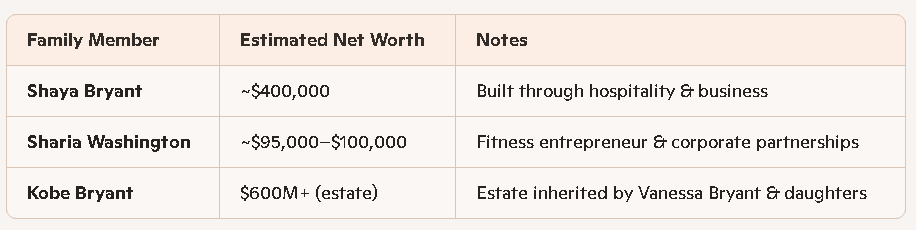 Shaya Bryant is far more than the sister of a basketball legend. She is a businesswoman, mother, wife, and resilient woman who has built her own identity with dignity. Her story is one of strength, independence, and grace — a reminder that meaningful lives are often lived away from the spotlight.